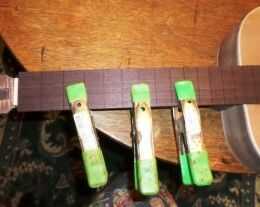 A continuación corté algunos arce para el atascamiento del lado de algún desecho que vino con mi guitarra hacia atrás o lateral madera. Se cortó un poco más ancha que el espesor de la Junta de traste. Luego marcó su grosor en la parte posterior de la Junta de traste y usar un plano para quitar palo adicional para hacer lugar para el enlace. Pensamiento de utilizar una fresadora para hacer esto pero decidí ir con precaución y lo hizo usando un plano y papel de lija. El atascamiento de arce fue entonces pegado y afianzado con abrazadera para el tablero del traste, lados primero, luego la pieza poco curvada en el extremo de la tabla cerca de la boca. Tuve que recurrir a algunos más creativos de sujeción. Después el pegamento nivelaron el enlace usando papel de lija.