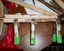 Untó pegamento en la superficie del cuello y un poco en la tarjeta de sonido (arriba) donde el tablero del traste se pone entonces sujeta por el cuello, limpiar la cola escurrida con una toalla de papel húmeda cuando fui. Tenía que usar una abrazadera en C para fijar el tablero del traste al cuerpo, ya que hay una ligera curva requerida por el conjunto de ángulo posterior del cuello. Espero que las cuerdas borran los trastes en este ámbito.