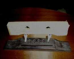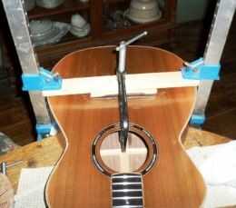 Había hecho los ajustes de medición de la tuerca a la silla de montar, y agujeros de 3/16 pulg. agujeros para los pasadores de extremo sujetarlo mientras que encolar perforados. Había tallada la forma de la tapa del puente usando un prensa del taladro el tambor de lijar en un bloque pequeño de madera y perforar agujeros para los pasadores. Usé esto con relleno un poco para ayudar a sofocar el puente durante el pegado. Me montaron a horcajadas el cuerpo de la guitarra con un trozo largo de madera y fijar los bordes para el cuerpo de la guitarra, presionando hacia abajo el bloque de puente.