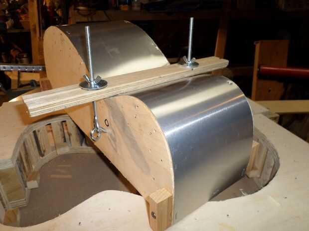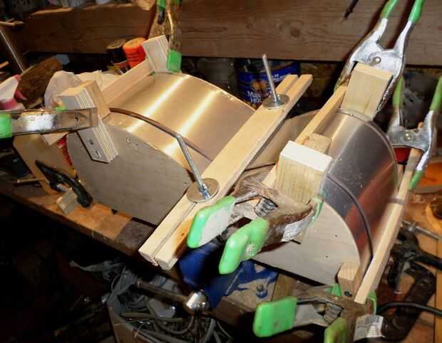 Una vez que la parte a doblar estaba en la caja de vapor durante varios minutos y había una abundancia de vapor escapando de sus articulaciones, lentamente sujeta la madera en el molde. Doblar fácilmente. Yo estaba contento como aliviado. Al día siguiente colocó el primer lado la lámpara de molde y afianzado con abrazadera en, luego pasó a la siguiente parte.