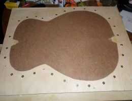Utilicé el mismo proceso de colocación de la espalda, pero esto es incluso más de una forma ciega y tiene más de una curva de la tapa armónica. En lugar de quejarse con abrazaderas pensé que se me ocurrió una manera diferente a la parte trasera de la abrazadera en. He marcado el contorno del cuerpo en una pieza de madera contrachapada de 1/4" y cortar aproximadamente 1/2" dentro de la línea. Luego perforé agujeros por 2-1/2" largo tornillos sobre un 2 pulgadas aparte todo el camino alrededor de él alrededor de una pulgada fuera de la línea. Luego marca los agujeros en la superficie del molde y perforar agujeros más pequeños para los tornillos en. Pegué sobre un trozo de madera prensada en forma de guitarra de mi lado disminuyendo plantilla. Después de aplicar el pegamento y forro las cosas lo mejor que pude enroscada mi improvisada Junta de sujeción.