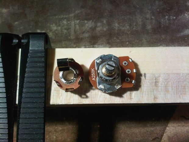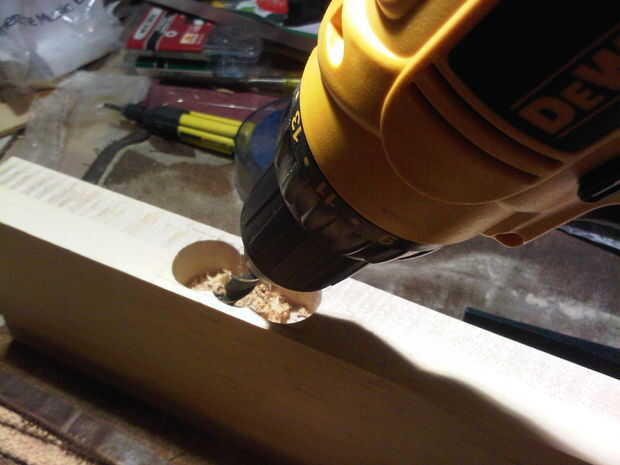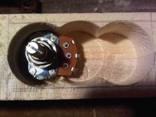 Como con la cavidad de la pick-up utiliza un taladro para quitar el material. Encontré que no era necesario para hacer cualquier trabajo de cincel aquí porque los componentes eran redondos. Asegúrese de que perforar lo suficientemente profundo para que el cable de guitarra conectar sin el fin de golpear la parte inferior del agujero. Luego siguió adelante y perforaron un orificio de 1/4" en un ángulo de la cavidad de control en la recogida de la cavidad los cables.