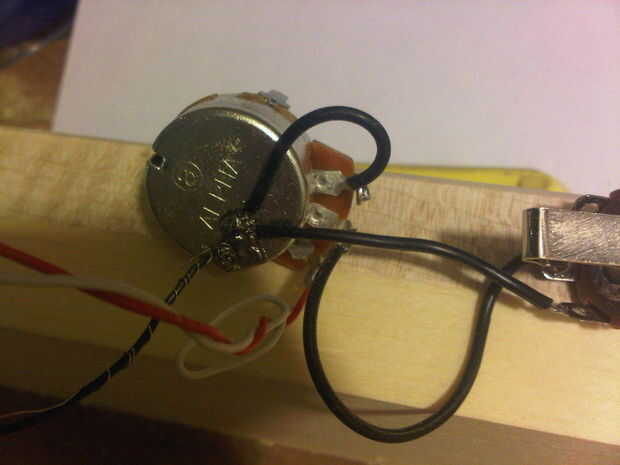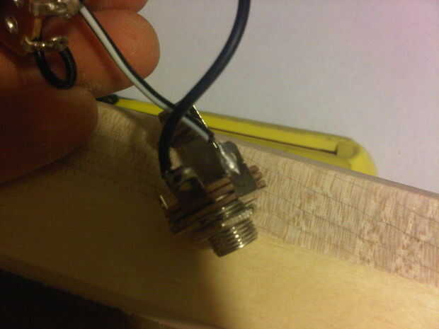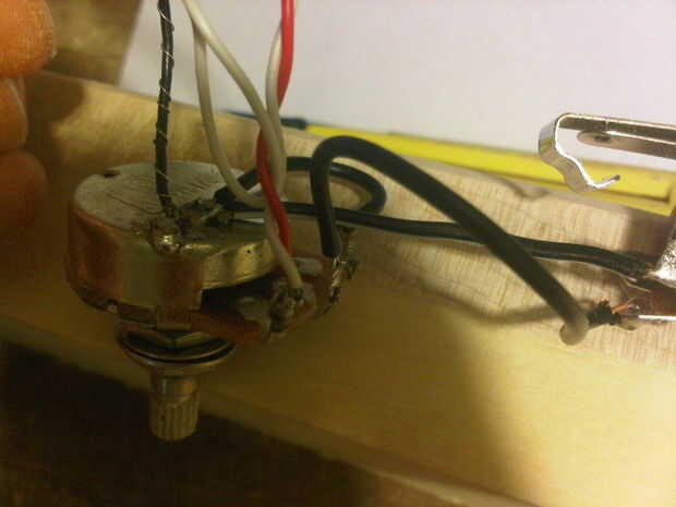 Una de las cosas que hacer ahora es hacer las conexiones de cable de perminant desde la captación hasta la toma de teléfono y pote de volumen. También se podría añadir un potenciómetro de control de tono si quieres pero esto es, después de todo, una estructura básica. Me gusta utilizar una punta fina en mi soldador debido a los espacios reducidos que se trata y el alambre de calibre pequeño involucrado. Simplemente siga el diagrama y hacer sus conexiones. Lo más probable es que han utilizado un jack estéreo para orientar el gato boca abajo con la lengüeta larga metálica que hace contacto con la guitarra plug (estoy seguro de que este pedacito tiene un nombre) más cercana a usted. continuación, utilice la ficha directamente a usted y a la izquierda.