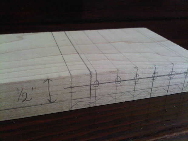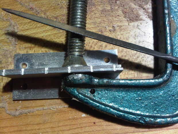 Que 2 de estos, uno actúa como una tuerca, el otro un puente. Luego se mide en 1/16" en cada extremo. Dichas marcas será para las secuencias de E. Luego, dividir el espacio restante para dar cabida a las otras 4 cuerdas. Cuando hacer muescas en el aluminio para las cadenas es importante tener en cuenta que la parte superior de las cuerdas deben estar a la misma altura así que todo lo que está haciendo realmente aquí está haciendo muescas superficiales para localizar permanentemente donde van a quedar las cuerdas. Que va a hacer el montaje final durante la puesta en marcha la fase final de la construcción.