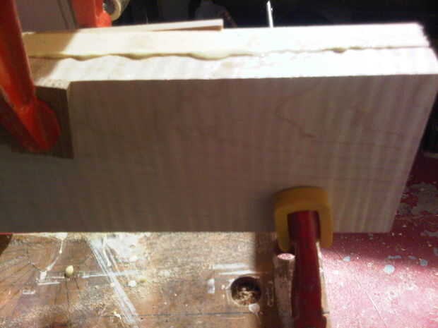 Lo ideal sería usando una tabla maciza 1 1/2" para este proyecto pero ya que los costos pueden ser prohibitivos fui con un laminado en blanco, la mitad superior es arce, la parte inferior la mitad es pino claro. Corte las tablas 32" largo y 4" de ancho, entonces si usted está usando un pegamento de método de construcción de 2 parte y sujetarlos juntos. Yo uso pegamento de carpintero de LePage pero puedes hacer lo que desee.