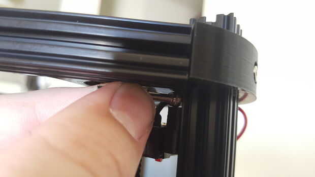 Ahora este paso será ahorrar unos 45 minutos cuando es trata de calibrar la impresora. Tomar cualquier tornillo M3 y colocarlo entre el Monte de la parada de final y el Vertice superior y apriete abajo el Monte de parada final. Dado que los rieles verticales queden al ras con la parte inferior y los vértices superior están espaciados a 10mm bajo el la parte superior de la OpenBeam.
