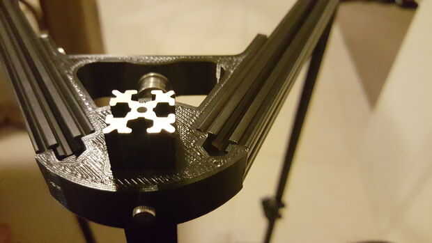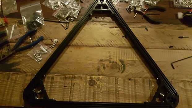 Tomar los vértices de la parte superior y Tornillos M3x8mm empuje a través de los lados (desde el interior con la tuerca hacia el exterior) y asegure con una tuerca atornillada libremente en. Siguiente diapositiva en un pedazo corto de abrir a cada uno de los vértices superiores de la viga y apriete hacia abajo luego alinearlos en un triángulo y al mismo tiempo empujar hacia los demás un poco hasta que se reúnan. Luego apriételos todos abajo