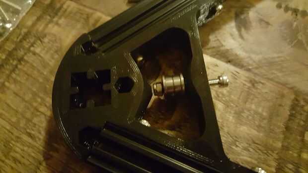 A continuación tomar un tornillo M3x30mm y atorníllelo en el los vértices superiores y lugar dos rodamientos con bridas en el tornillo con el reborde hacia el exterior. Una vez que el tornillo quede al ras con los cojinetes alicate para sujetar una tuerca nylock al cojinete y continúe atornillarlo.