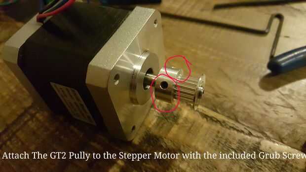 Coloque la polea GT2 en el Motor de pasos y atornille los tornillos pequeños Grub que viene con las poleas no apretarlos no todavía.