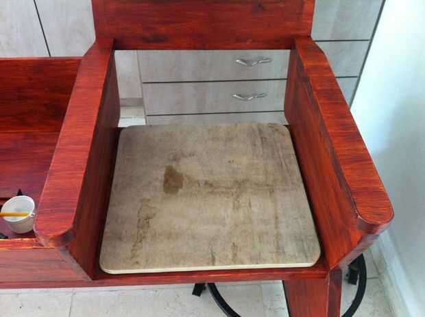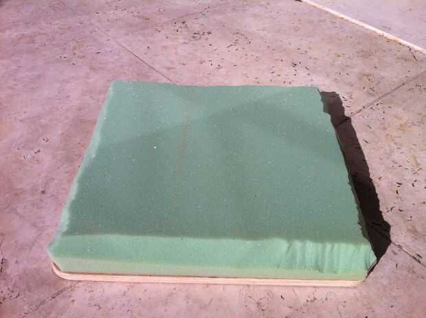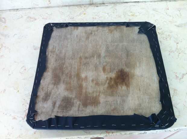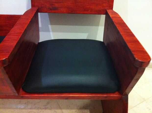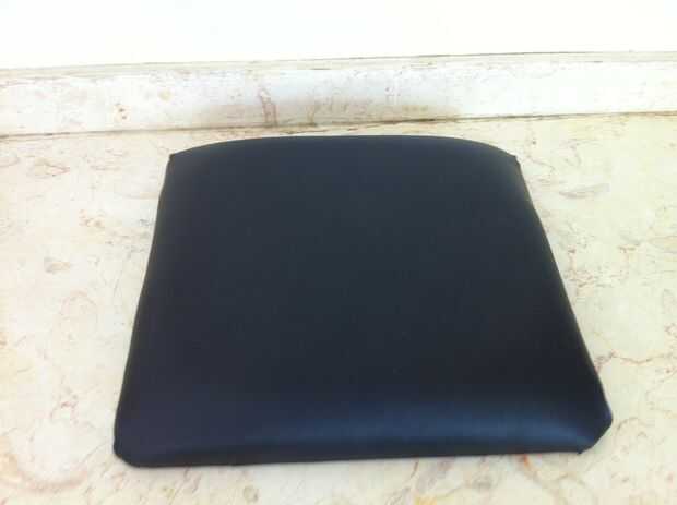 Asiento: Cortar un trozo de madera 42x44cm (al menos 0,6 cm de espesor), redondear los bordes, el colchón de la espuma a la madera con pegamento (o cualquier pegamento fuerte) del pegamento, corte el borde de la espuma en un ángulo 45 grados para darle una pendiente en los extremos. Usando una pistola de grapas, bien la grapa a la tela de su elección (yo escogí de cuero falso negro) desde todos los lados a la parte inferior de la madera luego cortar cualquier tela extra. Centro de la cosa entera en el asiento y fíjelo en su lugar utilizando tornillos ligeramente largo en la parte inferior (Asegúrese de que sus tornillos son lo suficientemente largos para llegar a través de la base pero no a través de la madera utiliza para la tapicería)
