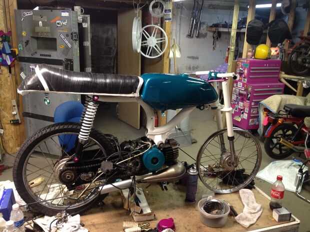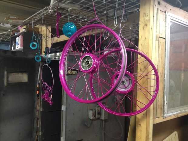 Una bicicleta de capa del polvo tiene varios pasos pero los resultados valen la pena. El final es más durable que la pintura y su resistente al gas y otras bicis de fluidos están probables que entren en contacto con. Inviernos de Michigan son frío y largo que le da un montón de tiempo para hacer bastante, además la calienta el espacio de la tienda!