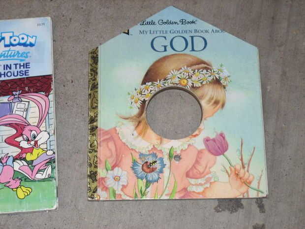 Recortar dos libros, luego use el cortador del agujero para hacer un gran agujero en el libro que desea ser en el frente y un orificio de 1/4" aproximadamente una pulgada por debajo del agujero grande.