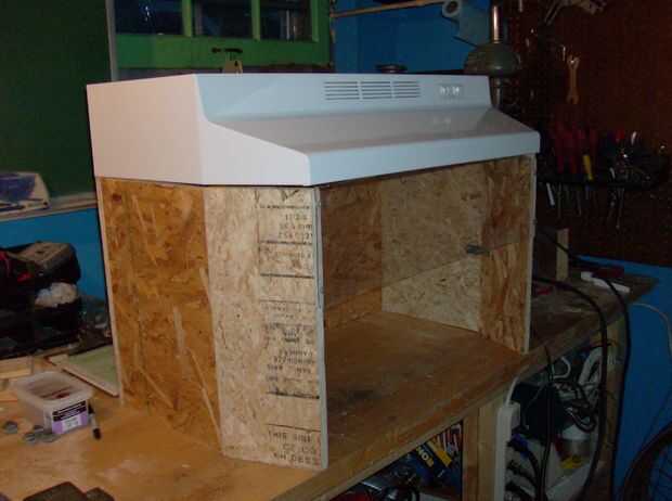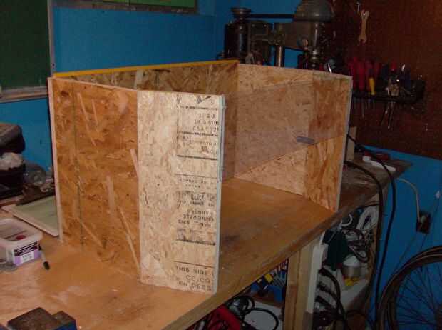 La sección delantera de mi campana hace un ángulo de 20 grados a los lados. Los paneles se cortaron en ese ángulo y atados con soportes planos doblados en el ángulo correcto en un vicio. La ventana delantera fue cortada y fijada a la caja. Taa-daa!