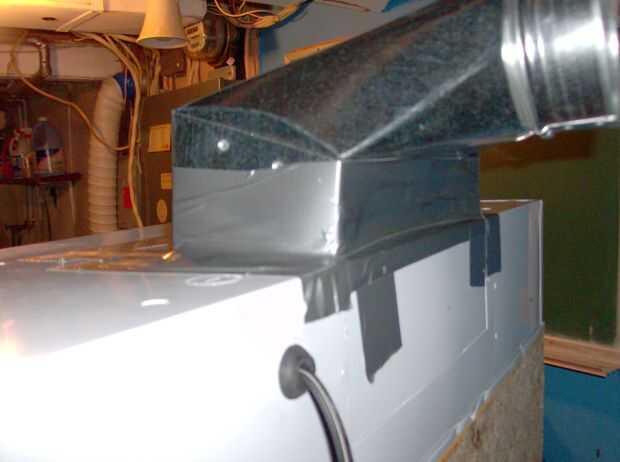 Los gases de escape necesita un lugar para ir una vez hojas la campana. Usé un cargador "universal" del conducto, aunque era un poco demasiado grande, para el escape de la campana rectangular para un conducto circular flexible. Por alguna razón, la ferretería supuesta fue que tenía botas de 4" o 5" los conductos, pero sólo vendió 3" y 6" conductos flexibles... vaya figura. En lugar de tratar en otro lugar, tengo el 4" arranque y 3" del conducto y planeado en forzarlo a trabajar, joder. Mal. Que terminé tener que reemplazar al final. Obtener un conducto de 4"(100mm), mínimo.