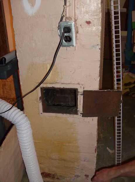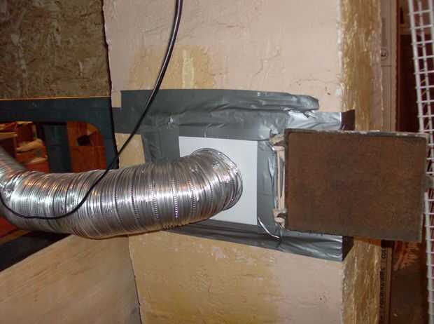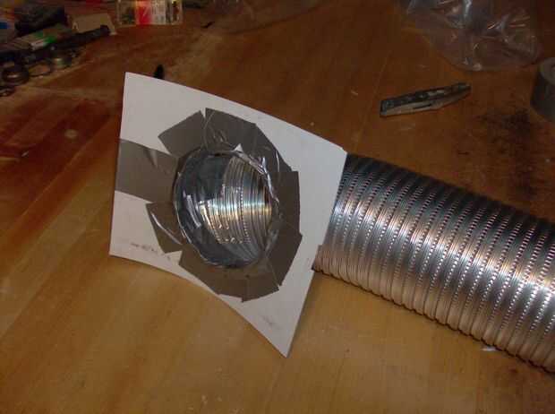 Para aparearse el ducto redondo con la puerta de acceso Plaza, hice un tabique de plástico de la hoja. La pieza debe ser al menos el tamaño de la abertura, y es una buena idea dejar un poco de superposición. Trace un círculo alrededor del conducto y recortarlo algo menor con un cuchillo. Cuidadosamente el extremo del conducto a través del orificio de la guía y sello y mantenga lo junto con cinta. Estirar el conducto algunas ahora antes sujetarlo a la pared, por lo que no será necesario tirar de la conexión más tarde. Cinta de la pared a la abertura de la chimenea y asegúrese de que es buena y sellado. En mi caso que la cinta no se pegaron bien al concreto pintado de mi chimenea, así que tuve que envolver alrededor de una esquina.
