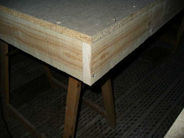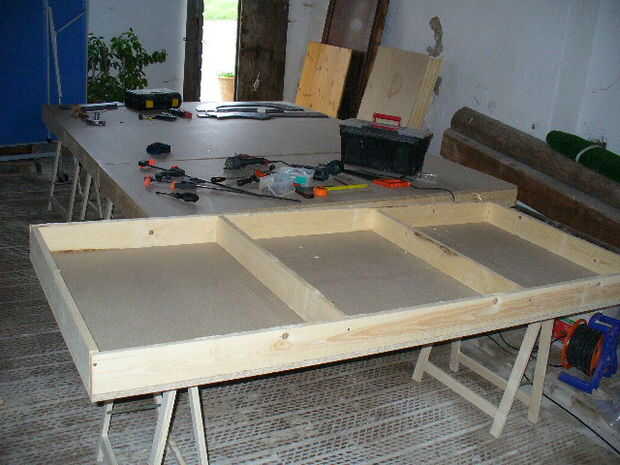 Es muy importante construir en una buena, fuerte, sólida base. He utilizado aglomerado de 12mm en un marco simple de madera, culata articulada, atornillado y pegado. Cada sección es de 1 m x 2 m y se encuentra en un par de caballetes de madera. Nunca sabes cuando puede mover casa o conseguir tiraron fuera de esa habitación de repuesto por lo que este tamaño es ideal. También cabe en la parte trasera de una pequeña furgoneta o coche de finca.