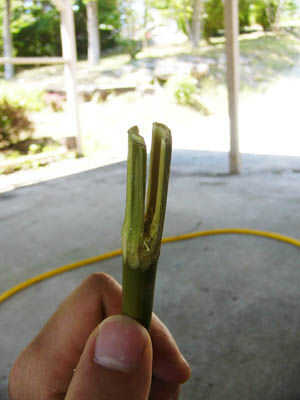 Luego, corté un nock en el back-end. Realmente lo único que es importante aquí es que usted el nock para terminar en una articulación. Si no la fuerza de la cuerda del arco eventualmente podría partirse la caña. La articulación un poco le da algo para empujar contra. Arreglé la flecha para que la parte más gruesa de la caña estaba en frente. Creo que esto pone el peso en el frente más y dejar que la flecha vuele mejor... Puedo equivocarme en este caso.
