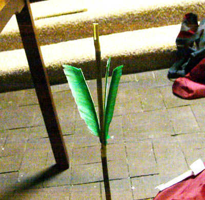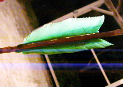 Pensé en dividir la parte trasera de la flecha y deslizamiento plumas u hojas a través de él pero no parece ser una situación muy fuerte. Así que, después de cortar las plumas a la forma y división de la columna vertebral, yo pegado a la flecha. A partir de la parte inferior, sólo seguí pegado arriba y enderezando las plumas cuando fui. Si tienes hilo, podría envolver la parte delantera de las plumas hacia abajo alrededor del eje. Esto sólo sería un poco más duradera.