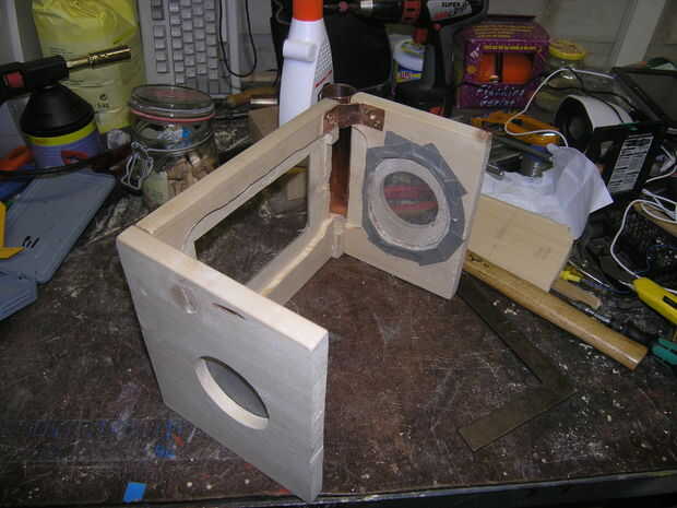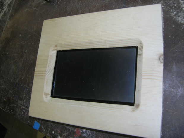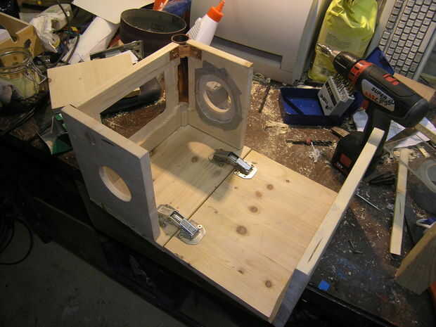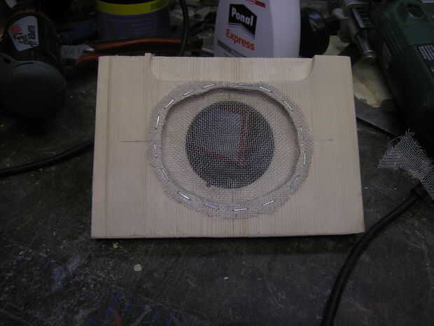 Por los altavoces que me Quito del medio material de la madera con el router, con la sierra vi los agujeros para los altavoces. Con rejilla pequeña proteger los altavoces contra el daño de oputside.