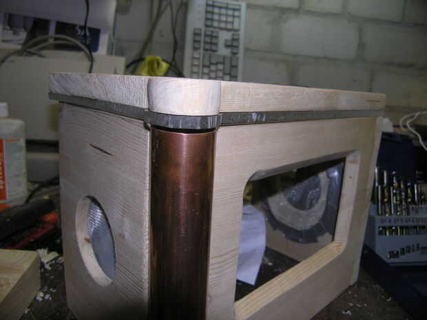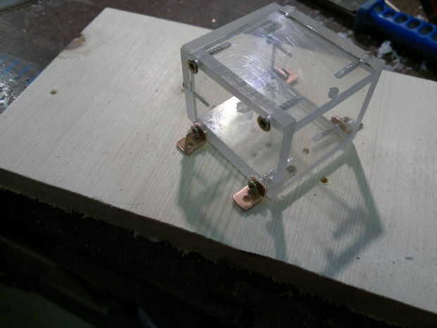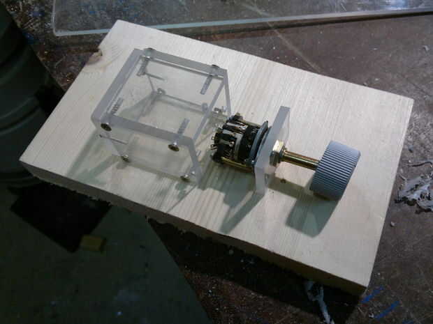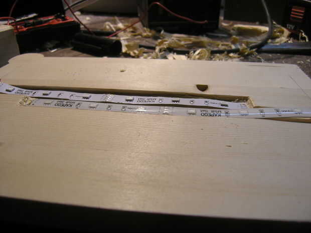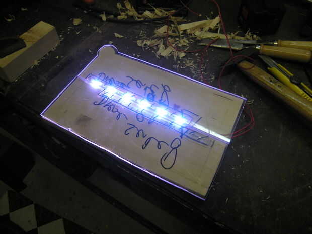 En la parte superior tallar una ranura para las franjas de LED, luego vi el cristal acrílico en forma de la parte superior. Los bordes son opacos para que la luz es buena para ver. (visto en la primera foto, solo color en el tiempo) Los LEDs son conmutable rojo-verde-azul-blanco, por lo tanto tomo un giro interruptor y construir una caja de acrílico para él.