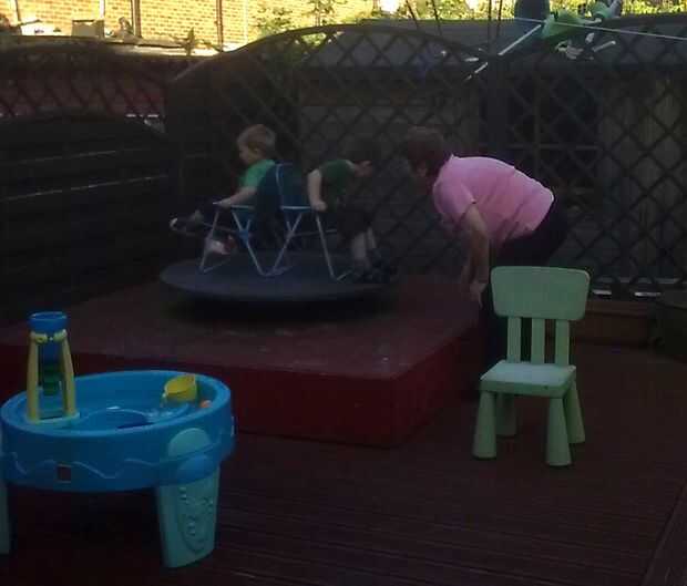Por desgracia esta rotonda ya no es. La madera sólo duró tres años fuera, si yo estaba construyendo otra vez trataría mejor madera. (o al menos algún tratamiento!). Tuve que buscar alrededor para ver las fotos de la rotonda en uso! Tengo unos videos muy pronto en DVD de los chicos jugando y empujando uno al otro.