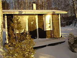 Se muestra en las dos primeras fotos son ejemplos de Sauna al aire libre tradicional se puede encontrar en Finlandia o en otros países de Europa del norte. La tercera foto es de mi edificio.