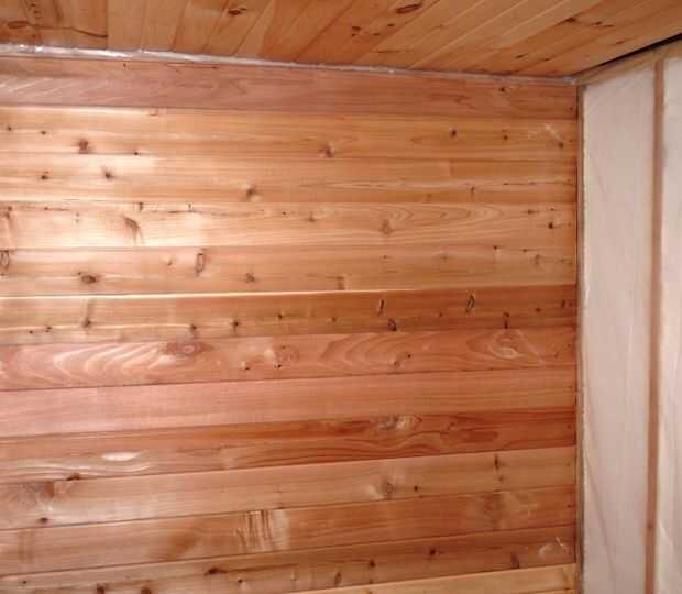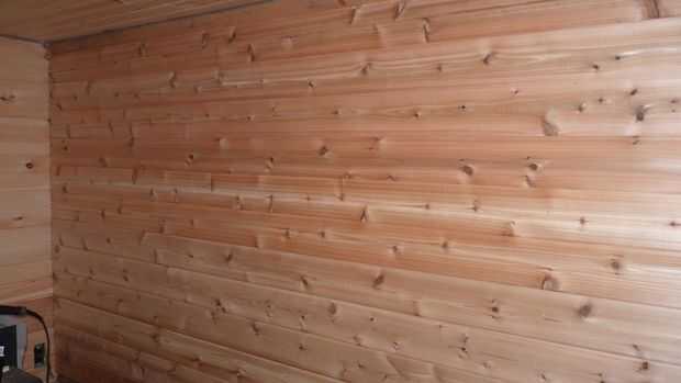 Interiores de sauna están tradicionalmente hechas de cedro, pero a veces se utiliza el abeto o pino. El cedro es más caro que el pino así que usé uno de cada uno. La pared frontal y techo detrás de la estufa está hecha de paneles pino de 8" ancho machihembrado de Menards. Este revestimiento se llama "revestimiento de coche", un término el gal snotty y hostil en el mostrador de servicio de Home Depot era al parecer desconocida con. Tienen los paneles, pero se llaman pino machihembrado. Al parecer mi Descripción de coches revestimiento como "paneles de machihembrado de pino" no fue suficiente para ella. Las paredes están cubiertas con 6" ancho cedro rojo casa de revestimiento, otra vez de Menards. Tuve que cavar durante un tiempo a través de la acción de consejos para encontrar a los que eran convenientes. Todo el revestimiento se une con galvanizado clavos excepto en duro para lugares donde usé tornillos de drywall acabado.