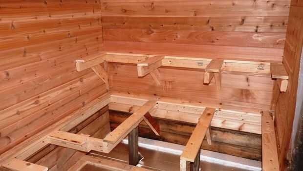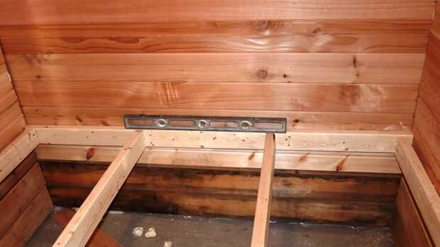 Primero construí marcos para los bancos de pino 2X4s. La parte de la estructura contra las paredes se une a través de los paneles a los postes con especiales 4-1/2 planas cabezas tirafondos. Los bancos más bajos tenían piernas de correos de apoyo y refuerzo de ángulo también unido a los postes. El Banco superior a utilizar ángulo refuerzo para dejar espacio por debajo. Los bancos se hacen de 5/4 cubierta de cedro tablas y espaciados aproximadamente 1/2" aparte. Cortar y colocar todos los tablones sin fijar primero entonces ajustar el espaciado para llenar los cuadros y marcado sus ubicaciones. La parte delantera del chasis donde colgaría sus piernas por el camino, también es de cedro tablaje de la cubierta.