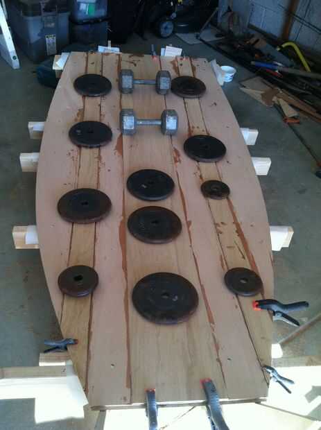 Centro de la parte inferior de la plantilla, colocar en ella a lo de proa y manténgalo presionado y temporalmente atornillar el 2 "x 4" 130mm cada lado del centro de la línea para permitir para el encolado de los duplicadores sin cubrir los tornillos, por lo que pueden eliminarse posteriormente. Los agujeros se llenará cuando el barco se quita de la plantilla con epoxi. Rasgar una hoja de 4' x 8' de madera contrachapada de 4mm en 1-240 mm tira y tiras de 2-80mm con un borde de 45 grados biselados. Esto puede hacerse una tabla o el ShopBot vio. Estos son los duplicadores de la parte inferior satisfacer el espesor mínimo de diseño mientras que ahorra peso. Una vez que estos se ajustaron en su lugar y ajustados usted está listo para instalar a los lados, mediados marco barco, proa y popa. La cuaderna de barco mediados puede utilizarse para colocar las tiras en el lugar correcto en la parte inferior del casco. Una vez que estos se ajustaron en posición, colocar algunos pesos en la parte superior, hasta la curación, funciona bien. Va cubriendo la ranura de la Junta de daga, pero que puede ser fácilmente cortado una vez que el casco se extrae de la plantilla y al revés para montaje del tronco de la Junta de daga y llenar de agujeros.
