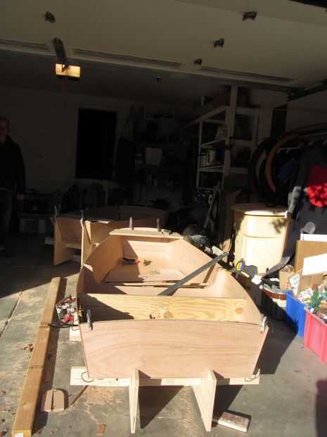 Los planes de mostrar dos llaves de temporales.  Estos se pueden hacer de cualquier madera de desecho y se utilizan para mantener la forma correcta de los lados mientras se hace la Asamblea y del pegamento hacia arriba.  Una vez instalados los rieles borda será quitados y desechados.  La proa y la popa encajan en la ranura en la parte delantera y trasera del panel inferior de casco.  Los lados se envuelven alrededor de los exteriores.  Unos pequeños bloques de madera atornillan a la plantilla en la proa y la popa ayuda a mantener los lados en su posición mientras las pinzas se aplican.   Una ranura pequeña a cortar las dos piezas de la plantilla hacia adelante para permitir que un pequeño bar abrazadera de su opción funciona bien para unir firmemente las dos partes.  Una vez que estás cómoda con el ajuste de todas las partes su listo para mezclar el epoxi.  Moje cada lado con epoxy espesado.  Agregue una pequeña capa de epoxi espesado y montar con apoyos temporales y medio barco soporte instalado.  El siguiente es el mástil cubierta y frustre.   Ajuste y de epoxy en el lugar.  Algunos de los desechos de 18mm pueden ser utilizados para el doubler en estas áreas.  Antes o después de este paso, puede instalar el doubler de proa y popa.
