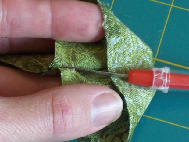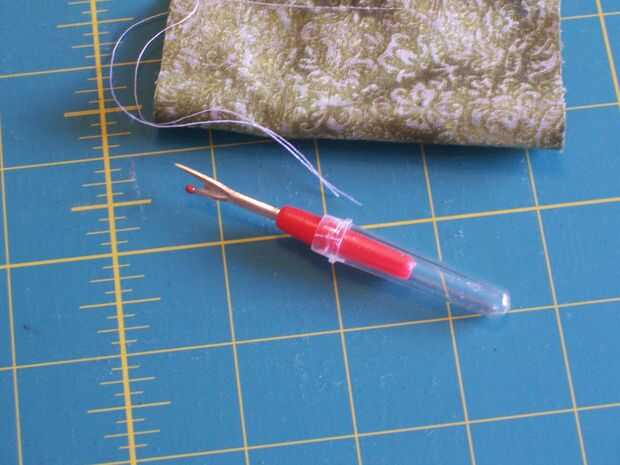 Para edredón cuadrados, ya que no copia de puntada, suavemente puede empezar a despiezar la tela piezas al final. Use su mano izquierda para mantenerlos separados mientras con su mano derecha para empujar al destripador de la costura a través de la línea de costura. La bola roja debe pasar por debajo de la tela y paseo a lo largo de la parte inferior de las puntadas y el filo interior de la "u" del destripador los cortes las puntadas.