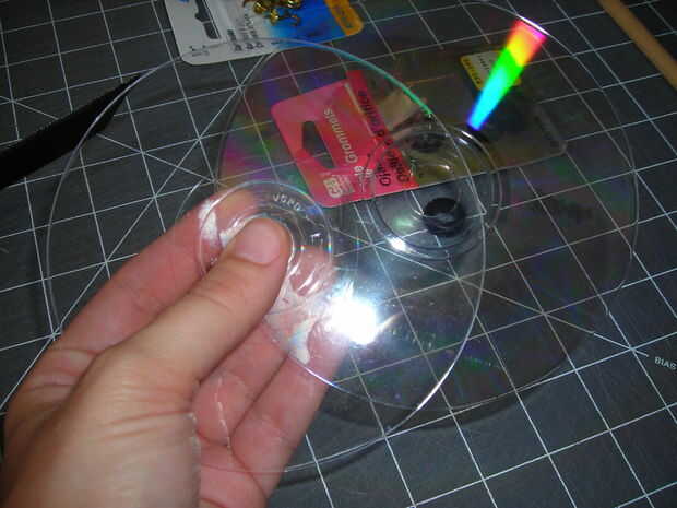 Poner los dos discos uno encima del otro de modo que los orificios estén alineados. Finura la arandela interior de los agujeros. Será un ajuste apretado. Asegúrese de que los dos discos están dentro de las arboledas de vinilo de la arandela.