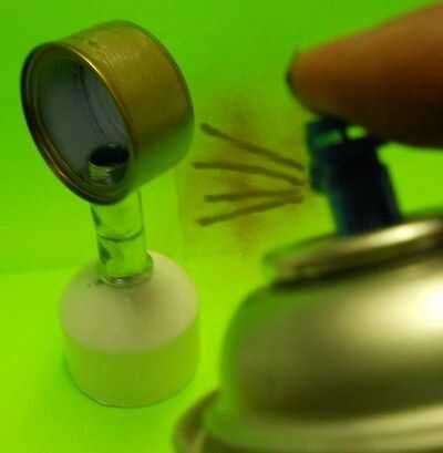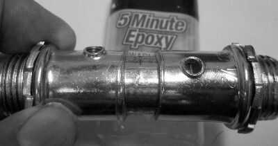 Retire los tornillos de los tubos conduit.  Usé un molino para moler los conectores planos, por lo que no se verían los agujeros de tornillo.  Pegué el pedazo de 2 pulgadas de conducto en los conectores con epoxi 5 minutos.  Luego perforar un agujero en la lata de atún y atornillar la pieza de conducto a.  Llené los agujeros de tornillo de ajuste con epoxi y arena todo ligeramente. Pinté todo el conjunto de micrófono de la parte superior con pintura de oro. Luego taladrar la tapa PVC y atornillados firmemente el conducto para.  Tenga cuidado de taladro en la tapa del PVC en el centro exacto de la parte superior... de lo contrario el micrófono estará sentado en un ángulo extraño encima de la tapa de extremo... y no se verá bien.