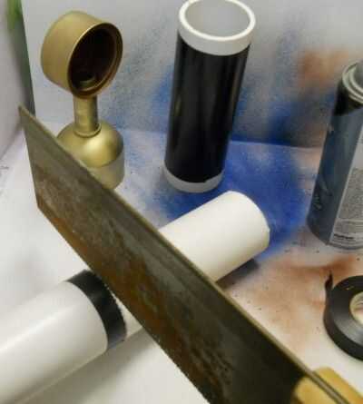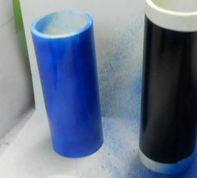 Utilizando el largo PVC tubos de 6 pulgadas... tienes que poner algún tipo de cinta alrededor de cada extremo de la tubería porque si pintas toda la conducción, hará un poco más difícil unir las piezas de PVC entre sí. Además, no pinte el PVC con el primer marrón... ya hice eso y luego cuando lo pinte azul... salió negro!!!!!! Así que tuve que hacer. Sólo arena lo hacia abajo ligeramente para que la pintura se pega y pinta de azul. Cuando la pintura se seca... montar la parte superior a la sección azul. Ya casi terminamos.