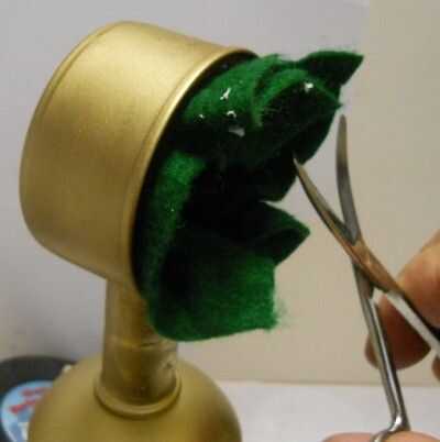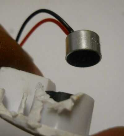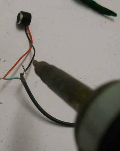 Encontrar un teléfono viejo o roto o contestador.  Quitar el elemento de micrófono.  Preferiblemente obtener uno de los elementos del micrófono capacitivo pequeña como en la imagen para mejor audio.  También puede usar un altavoz pequeño como un elemento de micrófono.  Suelde los cables del elemento de micrófono y el conector.  Debe conectar el cable rojo del micrófono a la patilla central de la toma de enchufe.  El cable negro es tierra.  Enrute el cable para arriba en la sección superior del micrófono.  CRAM poco desecho paño o arrugado de papel en el tubo conduit para ayudar a sostener el micrófono para que no tire el cable.  Cortar un pequeño trozo de tela de fieltro y pegamento blanco atrás del micrófono.  También coloqué un trozo de fieltro tela delante del micrófono para que no pueda ver el elemento de micrófono poco cuando se mira a través del frente "la rejilla".