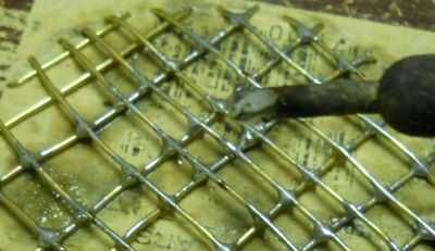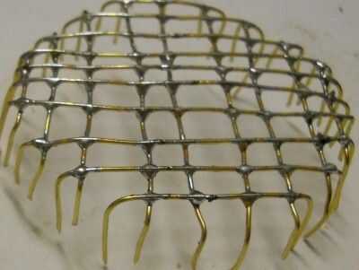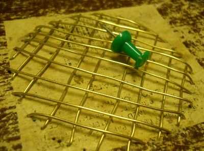 Este es el paso más difícil... Dibujé un círculo del mismo tamaño como el micrófono superior. Luego perforar agujeros en el cartón de desecho. Me colocadas las piezas de oro alambre en los agujeros luego les Soldamos todos juntos. Salió algo torcida. Probablemente vuelva a haré esta parte más adelante cuando se me ocurre un método mejor mirando de hacer la rejilla. Sin embargo, por ahora, es suficiente. Después de recorte de los cables en exceso... solo caliente pegar la rejilla en la lata.