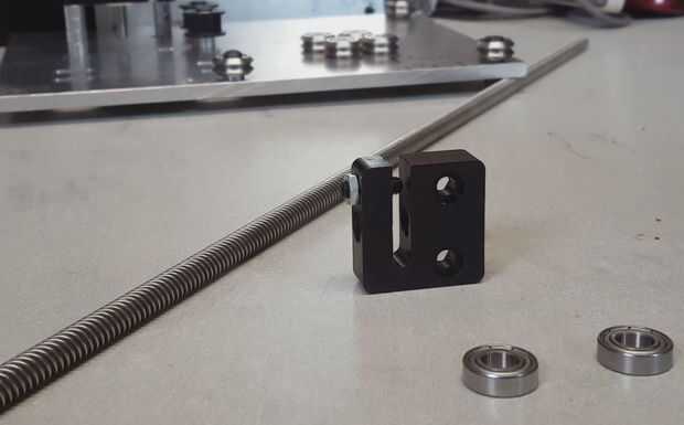 A diferencia de los 3 Shapeoko lo he planeado un tornillo un poco más tradicional impulsado por diseño del eje z. Estoy usando algunos de abierto construye "Tr8 * 8-2p" llevan tornillo y el bloque de tuerca anti-contragolpe para lograrlo. Yo soy depender pesadamente experiencia de construir mi propio custom z para mi Shapeoko 2.