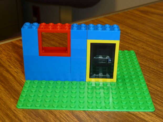 Para este paso se necesita su puerta amarilla y negra de 2 x 4. clavija pieza junto con una pieza de 2 x 4. clavija azul. Coloque el pedazo de puerta de 2 x 4. clavija a lo largo de la línea con el resto de las piezas que tienes en su lugar para que siga hacer base de línea recta a través de la verde. Coloque la pieza de 2 x 4. clavija azul encima de la puerta incluso a la altura con el resto de la pared.
