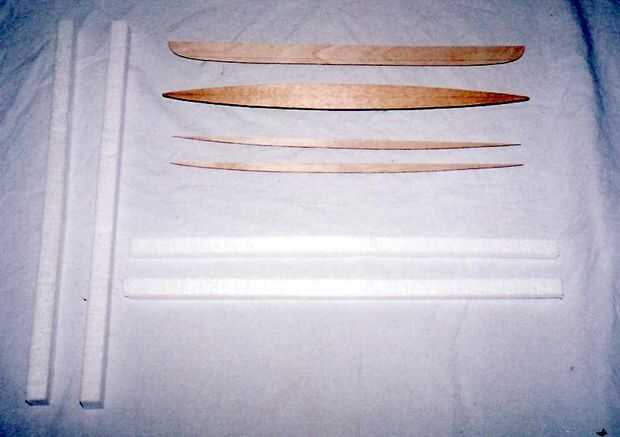 Estas son todas las piezas de un modelo de P01, el contrachapado muy fino, de tienda, corte directamente desde el dibujo, murciélagos de espuma de cortan lo suficientemente grandes como para incluir la madera. Aunque sus aristas son curvas, todos los componentes de madera planos, todos montaje carpintería es en ángulo recto y hecho fácilmente de esa manera por la Cruz-sección cuadrada de los rollos de espuma, que actúan como cuñas pegados.
