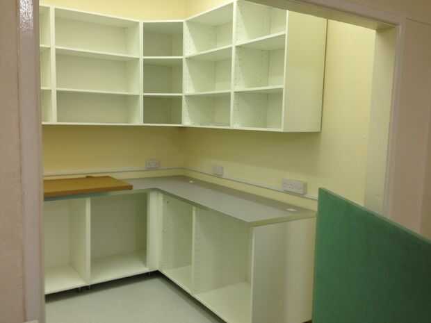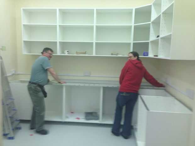 Una vez que los gabinetes estaban en su lugar, podríamos medir, cortar y montar las encimeras. Agregar en los estantes, ayudó a la cocina a tomar forma!