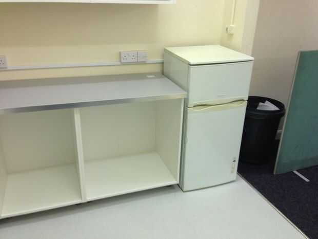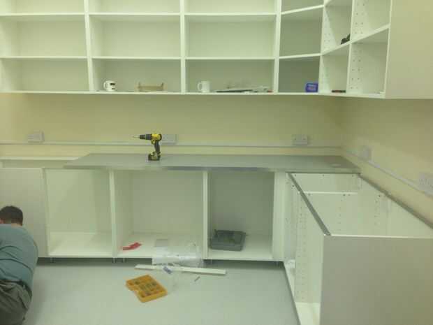 Una vez que los gabinetes de pared en su lugar, puede comenzar a trabajar en los inferiores. Un error que no fue compra de rieles para colgar los gabinetes inferiores - en retrospectiva, esto es barato y nos habría ahorrado muchas horas nivelar todos los archivadores individualmente. Si tienes el mueble patas, comience con el punto más bajo primero.