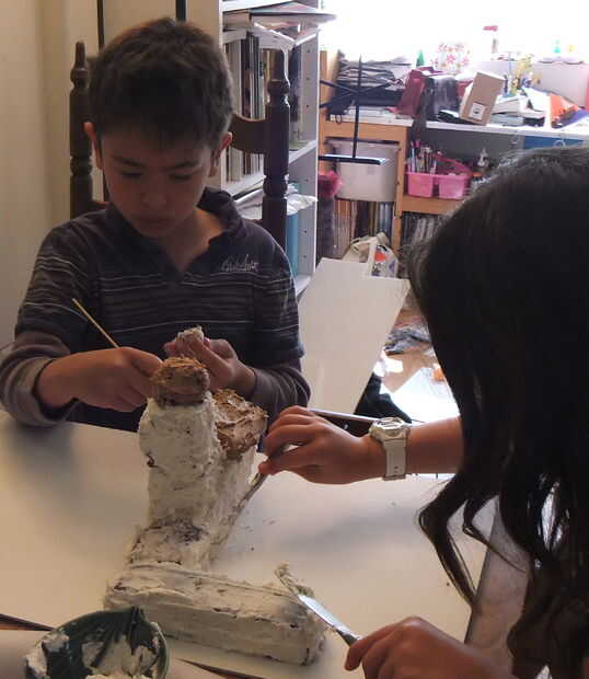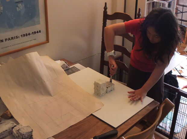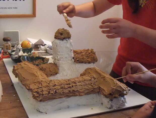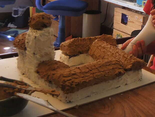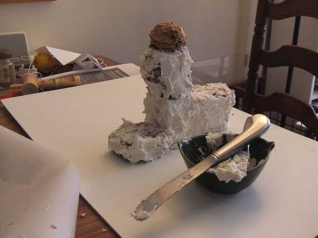 2. material para techos: Las piezas del techo fueron en la parte superior, después de todo el edificio blanco piezas se heló. Tienen una capa de betún marrón. Utilizamos un palillo para crear un patrón de azulejo.