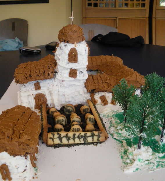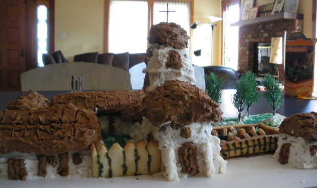 3. decoración: Utilizamos un tubo de glaseado para rellenar grietas en el glaseado blanco y para hacer las puertas y ventanas de betún marrón. También ponemos blanco escarcha en el suelo y espolvoreado con azúcar verde para zonas verdes y azúcar negra de suciedad. Hemos añadido algunos accesorios como árboles de modelo para la huerta y un poco cruzan hechos de palillos de dientes de la parte superior de la torre del campanario. Luego decoradas nuestras cookies y ponerlas en los lugares apropiados para el cementerio, cercas y puertas.