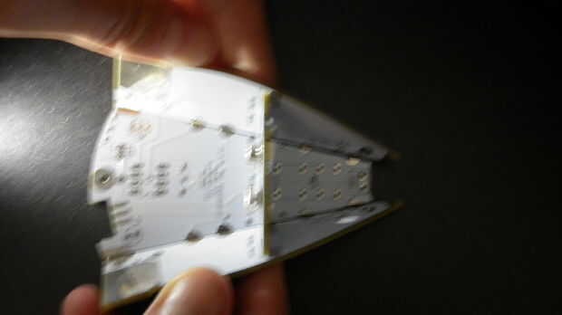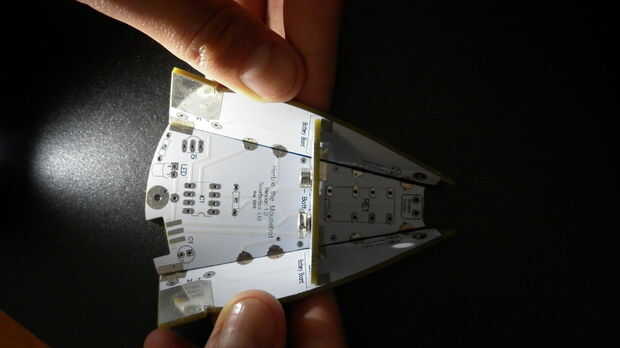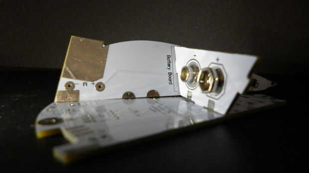 Usar la cinta adhesiva para ayudar a sostener las placas juntas. El punto conector de la batería hacia el lado más ancho de Herbie. Una vez estables, calentar la soldadura en los pares de la almohadilla principal conectar Herbie.