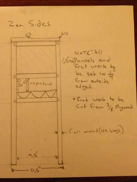 Debe ser el panel grueso de 1/2" 7.5" de alto y 9 3/4 amplia el último 1/8 a cada lado cortado a 1/4" densamente en el centro para insertar en las ranuras de panel de pierna. Barras transversales deben ser 1X1X 10 de largo con el último 1/4" a cada lado, cortado a 1/4" densamente para insertar en la pierna cruzada miembro ranuras.