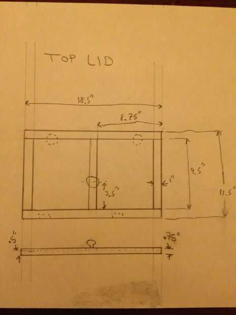 Esta tapa personalizada de "ala de gaviota" es mi interpretación de la pieza original. Un diseño único de cajón o de tapa puede ser preferido. Corte el material grueso superior 1/2" a 18,5" X 11.5". Añadir 1 "X 1/4" tiras de los bordes superiores en todo y bisecan el centro como en la imagen.