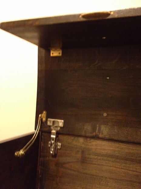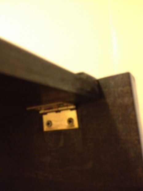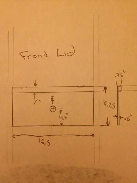 Cortar material grueso de 1/2" a 8 1/4" X 16 1/2". Agregar un 1 X 16 1/2 "X 1/4" espesor tira a la parte superior. Esta parte debe conectarse a la tapa superior por dos bisagras como en la imagen. Pueden taladrar agujeros hasta 3/8" profundidad de la parte superior bisagras según sea necesario. Usé las bisagras gabinete de cocina de extensión completa para asegurar la tapa a la parte posterior del gabinete como se muestra. También es necesario un seguro de la bisagra para evitar que la tapa de golpear abajo inesperadamente.