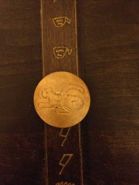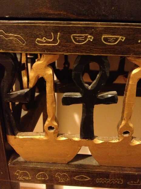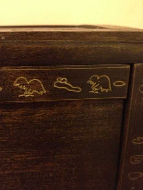 Búsqueda en Google "jeroglífico al traductor Inglés" para encontrar una fuente de frases deseadas. Mina dice "Las familias son para siempre" y tiene cada uno de nuestros nombres. Lápiz dibuja los jeroglíficos entonces utilizar un cutáneo herramienta y corte de bola para tallar los símbolos de 1/16". Dos perillas también deben ser talladas con un símbolo como se muestra. Siguiente uso 3/8 madera contrachapada trabajar el traste. Dos de 4,75 "X 16,5" y dos tablones de 4,75 "X 9.5" deben cortar y verificados para encajar en los marcos. Ajuste según sea necesario para conseguir un ajuste fácil. Esbozo de los símbolos como había deseado y recorto. Arena para cada borde redondo.