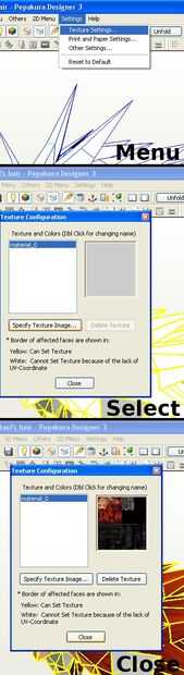 2) el modelo se carga sin su textura. (Aparecerá blanco llano). Se debe establecer por separado a través de la barra de menús: configuración \ parámetros de textura... \ especificar textura imagen... Esto no es realmente necesario, sin embargo teniendo cosas en color ayuda mucho en agrupar piezas y generalmente sano.