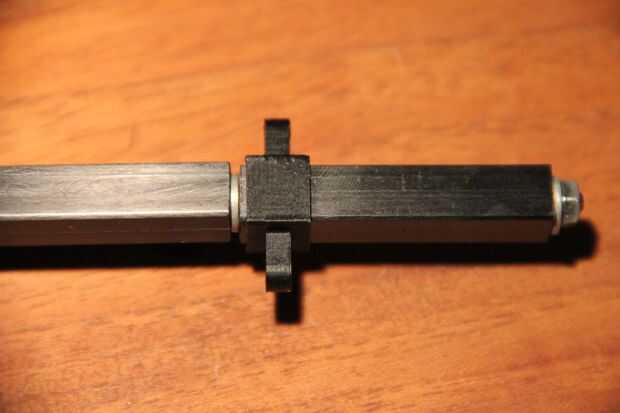 Ahora puede colocar al último separador impreso 3D en el otro extremo de la varilla de M4 asegurado en su lugar por una o dos tuercas (no necesita dos tuercas pero puede sacudir por dentro del tubo con una única tuerca). El tubo de fibra de carbono 100mmm puede deslizarse sobre los espaciadores y asegurado en el final con otro combo de arandela y la tuerca. El tubo de 100mm no debe poder girar libremente.
